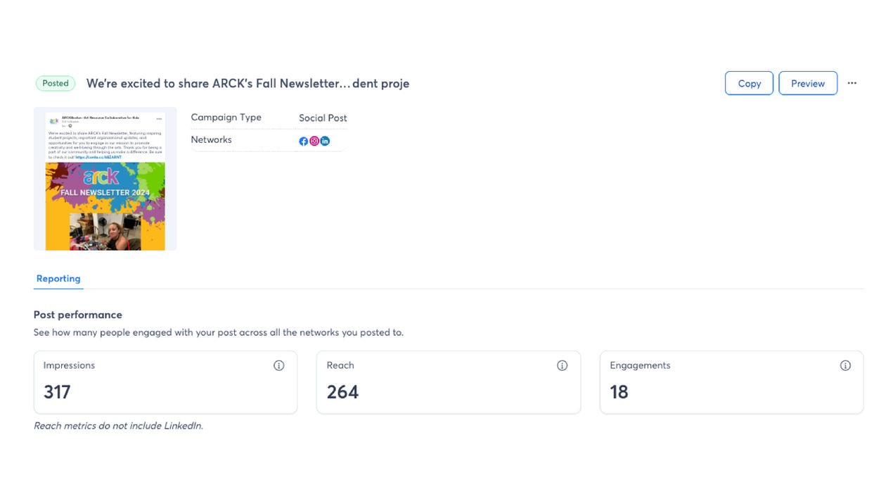 Email marketing campaigns focused on fundraising outreach, donor retention, introducing new programs, timely organizational updates, and highlighting artwork produced by students who participated in ARCK's curriculum, and seasonal outreach.
